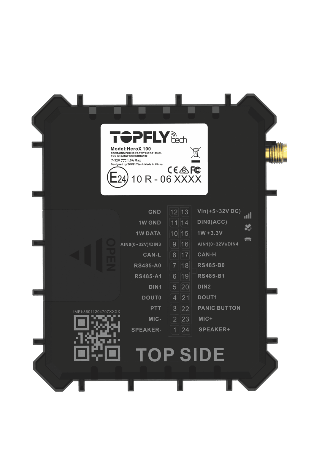 El HeroX 100 es el rastreador vehicular más potente de la línea TopflyTech. Diseñado para instalaciones profesionales en flotas, transporte pesado y soluciones OEM, combina conectividad 4G LTE Cat‑1, múltiples interfaces de entrada/salida, lectura de datos CAN, sensores BLE de largo alcance y monitoreo avanzado de comportamiento y accidentes.